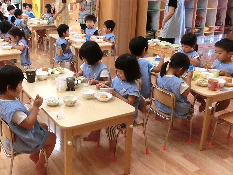 こども園に入園するということは、大好きなお母さんと離れての生活の始まりです。子どもは、 今までの暮らしが変わることを「どうしてこうなるの」「どうしてお母さんがいないの」と、 泣くことで表現します。でも、子どもは泣きながらでも見て聞いているので、「おやつよー」 「お食事よ」の声に、「あれ、これはなにかな?」と、ちょっと泣きやみます。食べると 満足して泣きやみ、遊び始めたりして、「うん、ここもわるくないぞ」と感じてくれるでしょう。 こども園給食は、新しいお友達が一日も早く保育園を大好きになれるよう、正しい食習慣を身に 付けながら安全で美味しくて楽しみにしてくれる給食を心掛けていきたいと思っています。